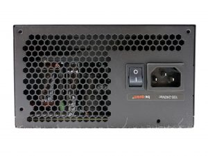 The front exhaust grille is not optimized for high airflow, since a major part of it doesn't feature any ventilation holes. The power switch is located right next to the AC receptacle.
