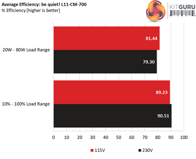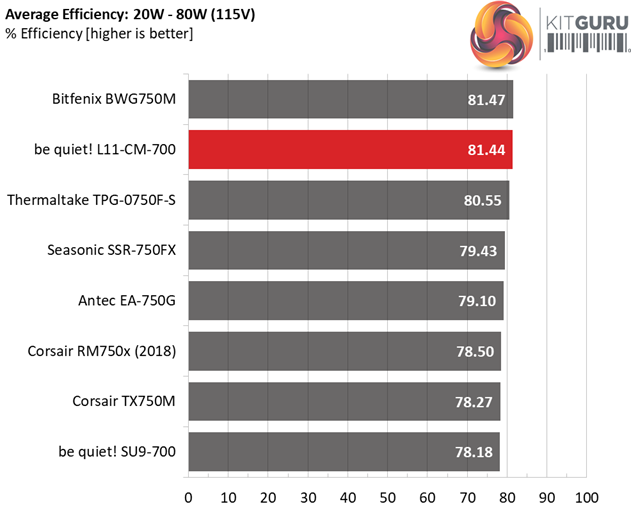 In the following tests, we measure the L11-CM-700's efficiency at loads significantly lower than 10 percent of its maximum capacity (the lowest load the 80 PLUS standard measures). The loads we dial are 20, 40, 60, and 80W. This is important for representing when a PC is idle, with power-saving features turned on.