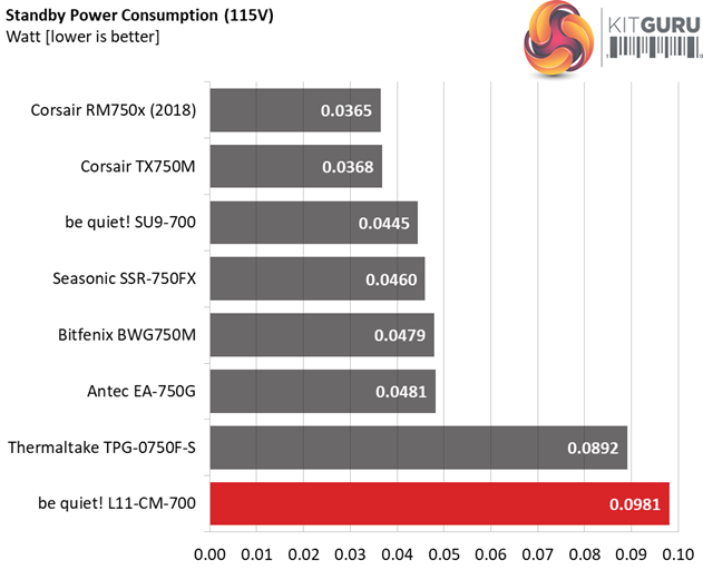 In the table below, you’ll find the power consumption and voltage values of all rails (except -12V) when the PSU is idle (powered on, but without any load on its rails), and the power consumption when the unit is in standby mode (without any load, at 5VSB).