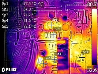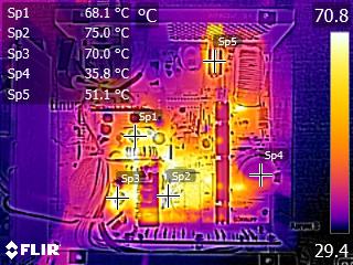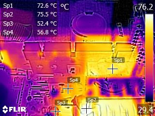 The caps close to the chokes of the secondary side get quite hot, and this can be a problem since they belong to Teapo's mainstream SC line. Other than that, we don't spot anything strange in those IR shots. The temperatures in the rest components are kept at normal levels, considering this platform's efficiency.
