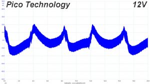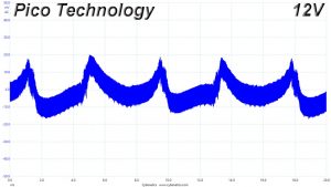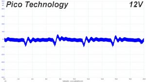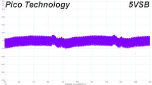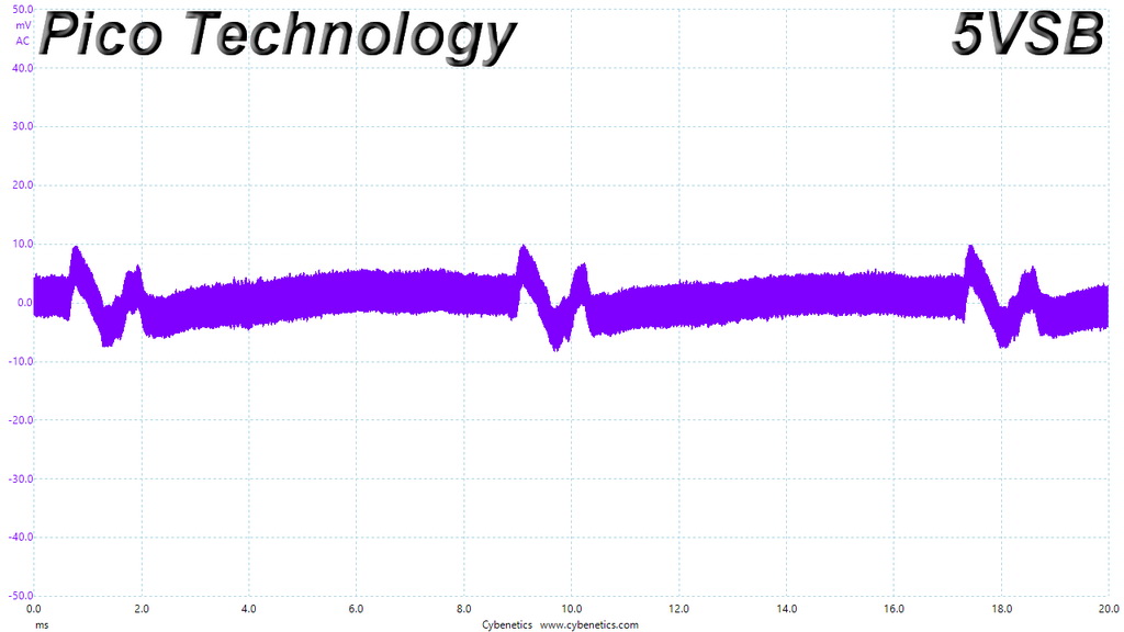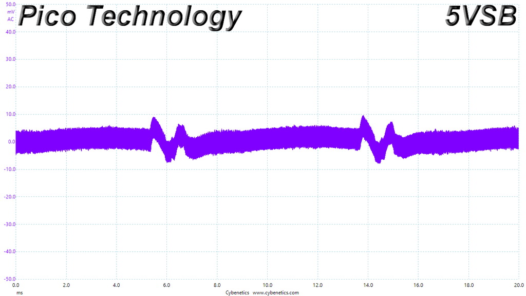 The following oscilloscope screenshots illustrate the AC ripple and noise registered on the main rails (+12V, 5V, 3.3V and 5VSB). The bigger the fluctuations on the screen, the bigger the ripple/noise. We set 0.01 V/Div (each vertical division/box equals 0.01V) as the standard for all measurements.