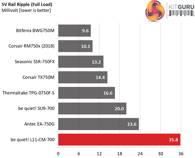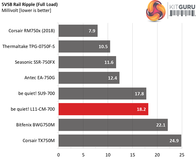 The ripple suppression cannot meet the competition in this price range, with both the Seasonic SSR-750FX and Bitfenix BWG750M units achieving much better results (with only exception the 5VSB rail where the BWG750M falls a bit behind).