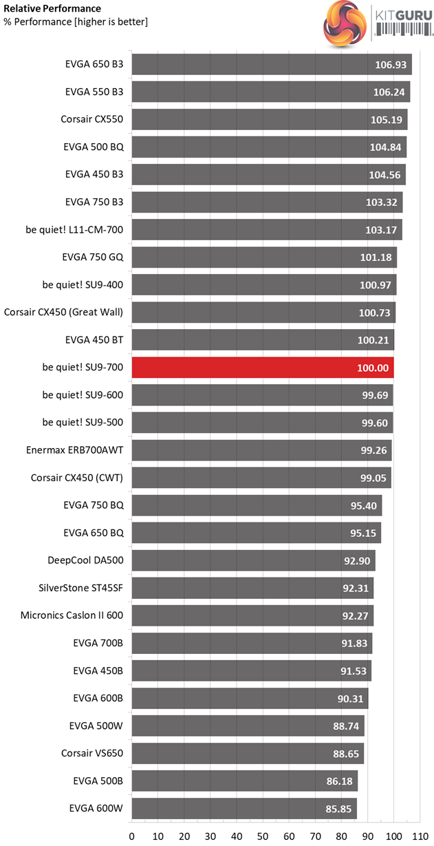 Compared to similar spec units, the SU9-700 fares pretty well as you can see since it leaves many other models behind. Only the more expensive EVGA B3 units perform notably better, but those belong to a higher category.