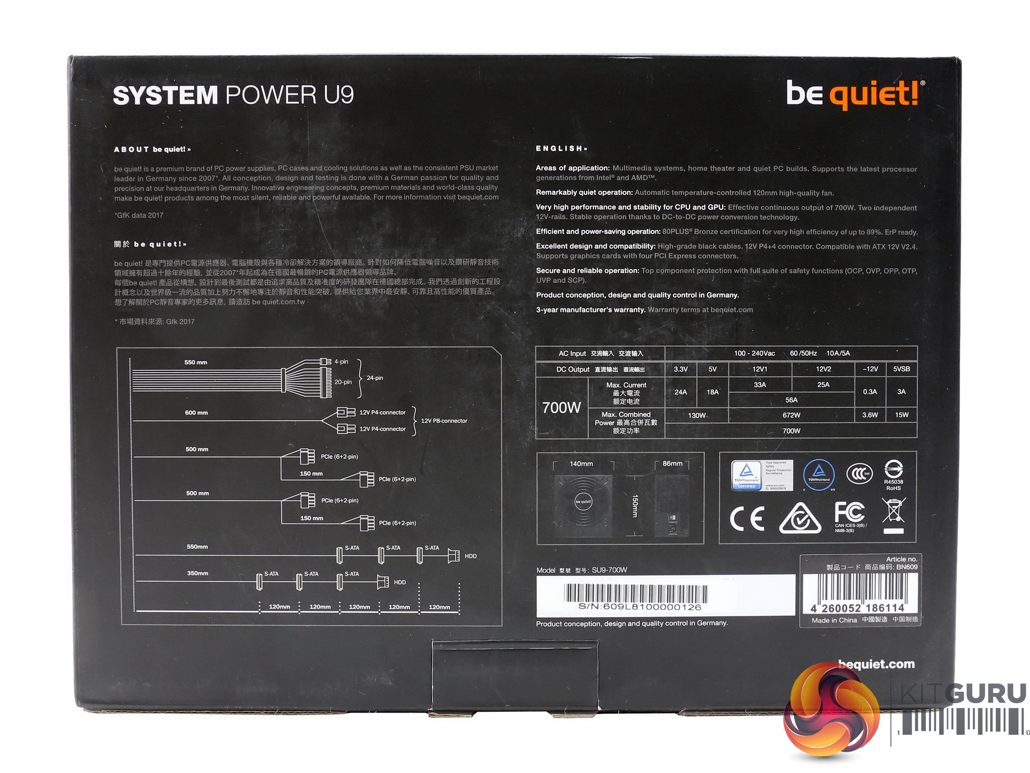 At the rear there is a diagram showing the cable length and the number of available connectors. You will also find the power specifications table along with the unit's dimensions and a number of badges, depicting the various certifications that this product meets.