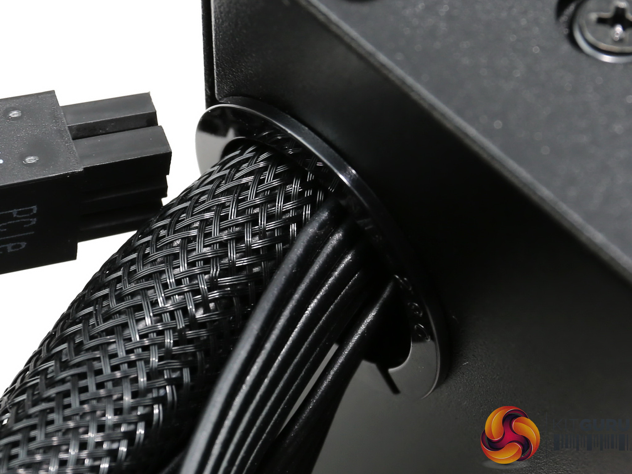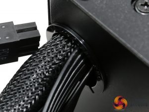 There is a plastic grommet around the cable exit hole, protecting the cables from the cases edges. Speaking of the cables, the main ATX is fully sleeved back into the housing while the rest are flat.