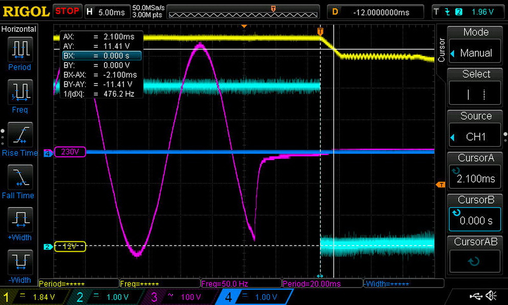 The hold-up time is much lower than 17ms. This was expected since the bulk cap is small. At least the power ok signal is accurate.