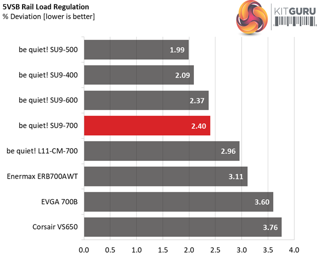 The first set of tests reveals the stability of the voltage rails and the SU9-700’s efficiency. The applied load equals (approximately) 10 to 110 percent of the power supplies maximum load in increments of 10 percentage points.