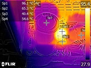 The temperatures on the DC-DC converters are high, because we stress those pretty hard with 12 Amperes of load on each of the minor rails. A resistor right behind the NTC thermistor also has high temperature, a clear indication that energy is lost on it.