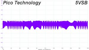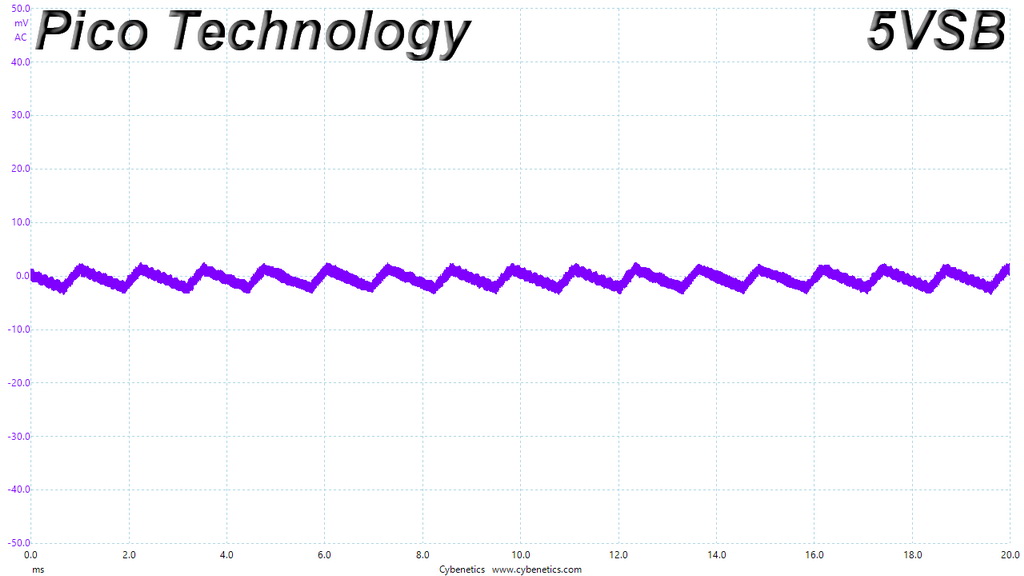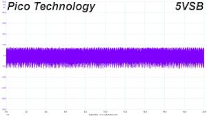 The following oscilloscope screenshots illustrate the AC ripple and noise registered on the main rails (+12V, 5V, 3.3V and 5VSB). The bigger the fluctuations on the screen, the bigger the ripple/noise. We set 0.01 V/Div (each vertical division/box equals 0.01V) as the standard for all measurements.