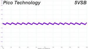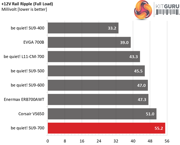 The ripple suppression is not that good at +12V. We would like to see below 50mV on this rail and ideally less than 40mV. On the minor rails the performance is better.
