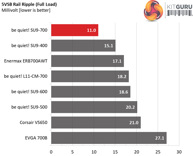 The following table includes the ripple levels we measured on the SU9-700’’s rails. The limits, according to the ATX specification, are 120mV (+12V) and 50mV (5V, 3.3V, and 5VSB).