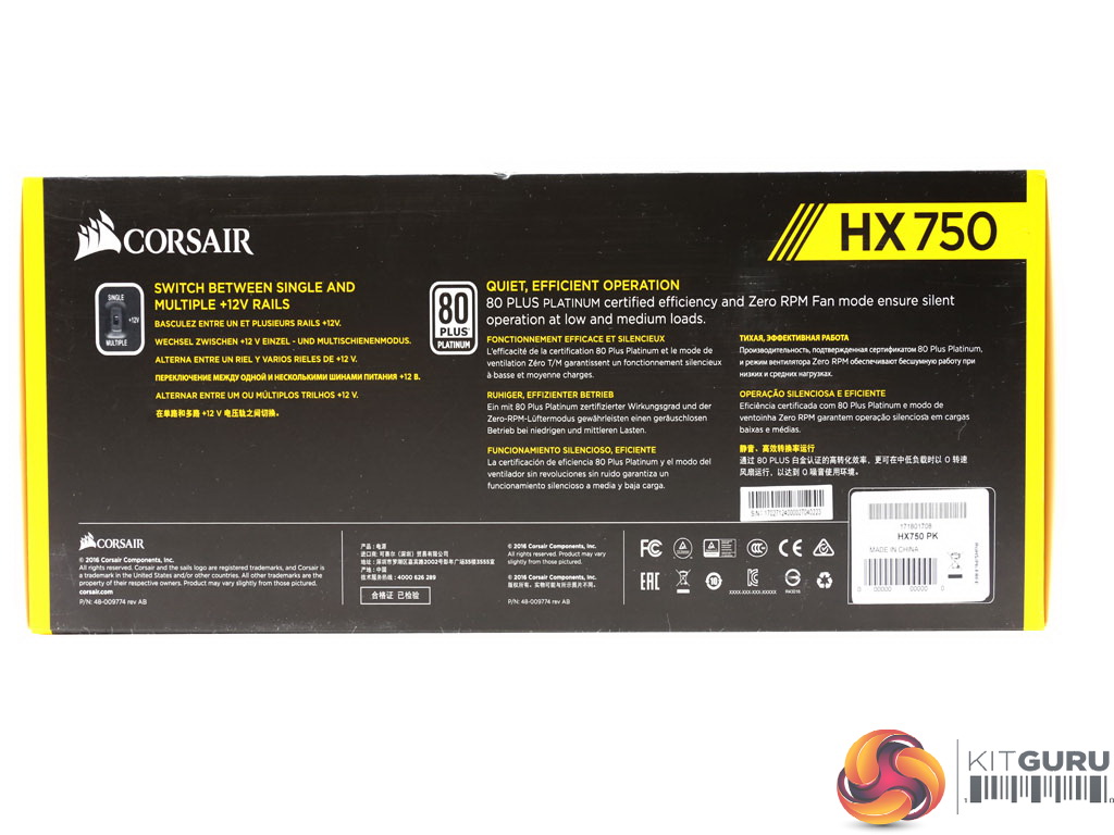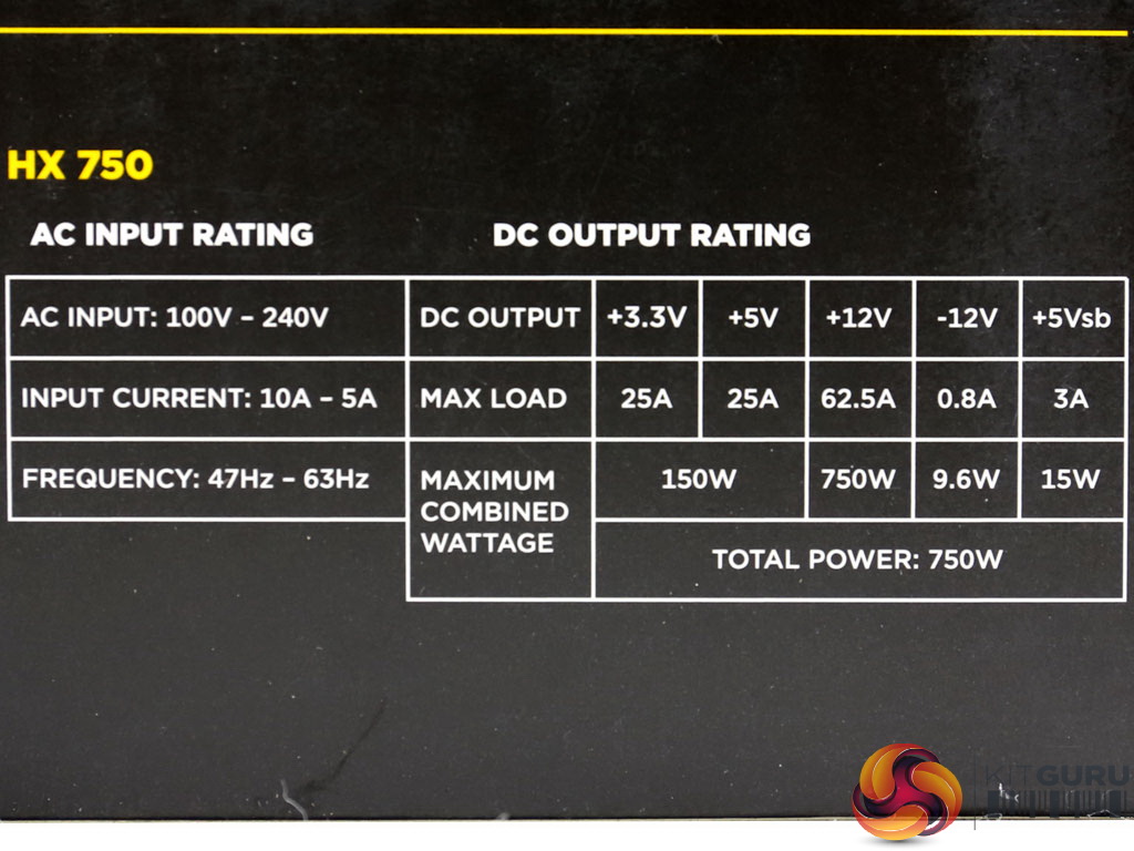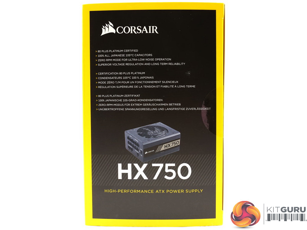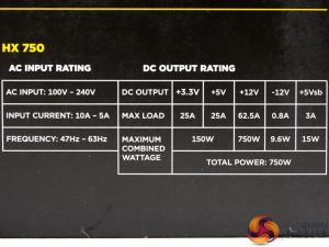 Around the back you will find the power specifications table and a scheme showing the HX750's dimensions. Finally, at the top side of the box Corsair provides a list with the available connectors and the cable length.
