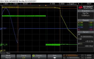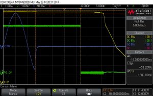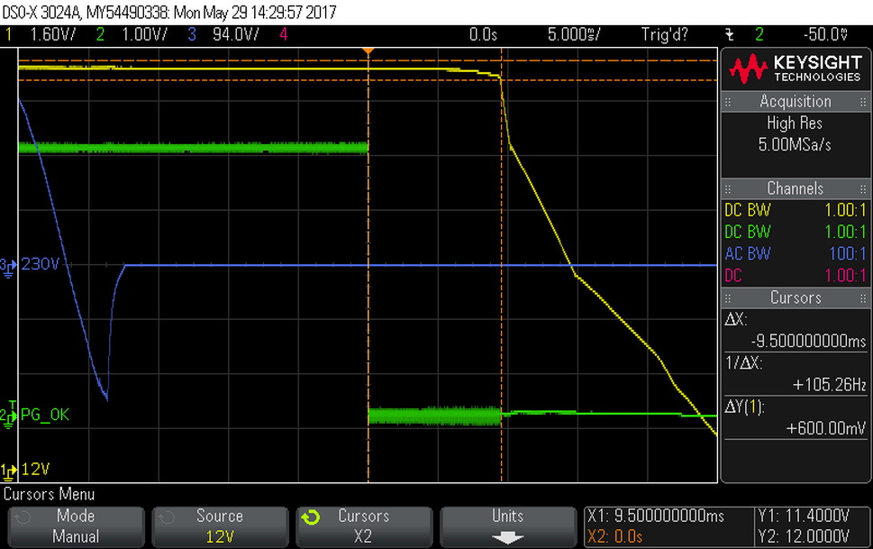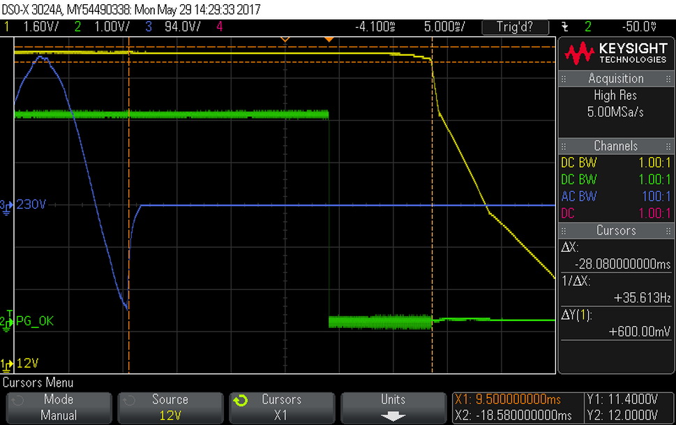 The hold-up time is quite long and the same applies for the period between the power cut and the moment that the PSU informs the mainboard that it needs to shut down, through the power-ok signal.