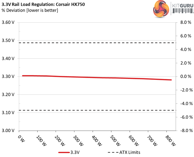 The first set of tests reveals the stability of the voltage rails and the HX750’s efficiency. The applied load equals (approximately) 10 to 110 percent of the power supplies maximum load in increments of 10 percentage points.