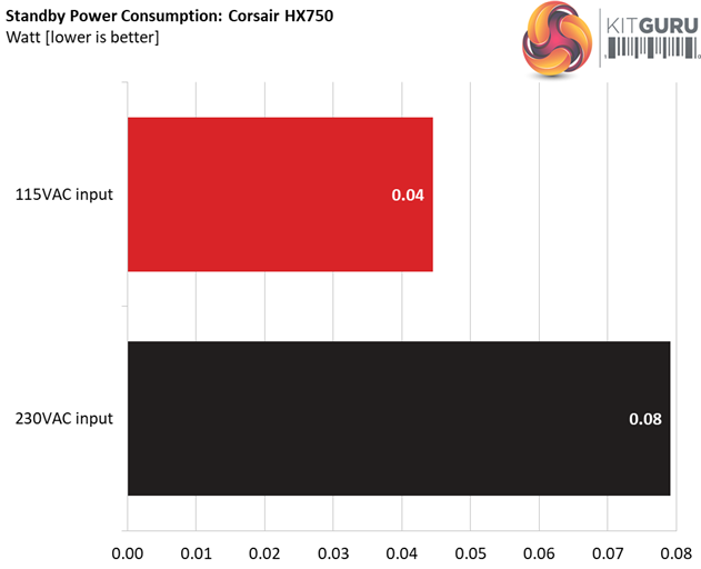 In the table below, you'll find the power consumption and voltage values of all rails (except -12V) when the PSU is idle (powered on, but without any load on its rails), and the power consumption when the PSU is in standby mode (without any load, at 5VSB).