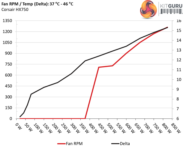 The first chart below illustrates the cooling fan's speed (in RPM), and the delta between input and output temperature. The results were obtained at 37°C (98.6°F) to 46°C (114.8°F) ambient temperature.