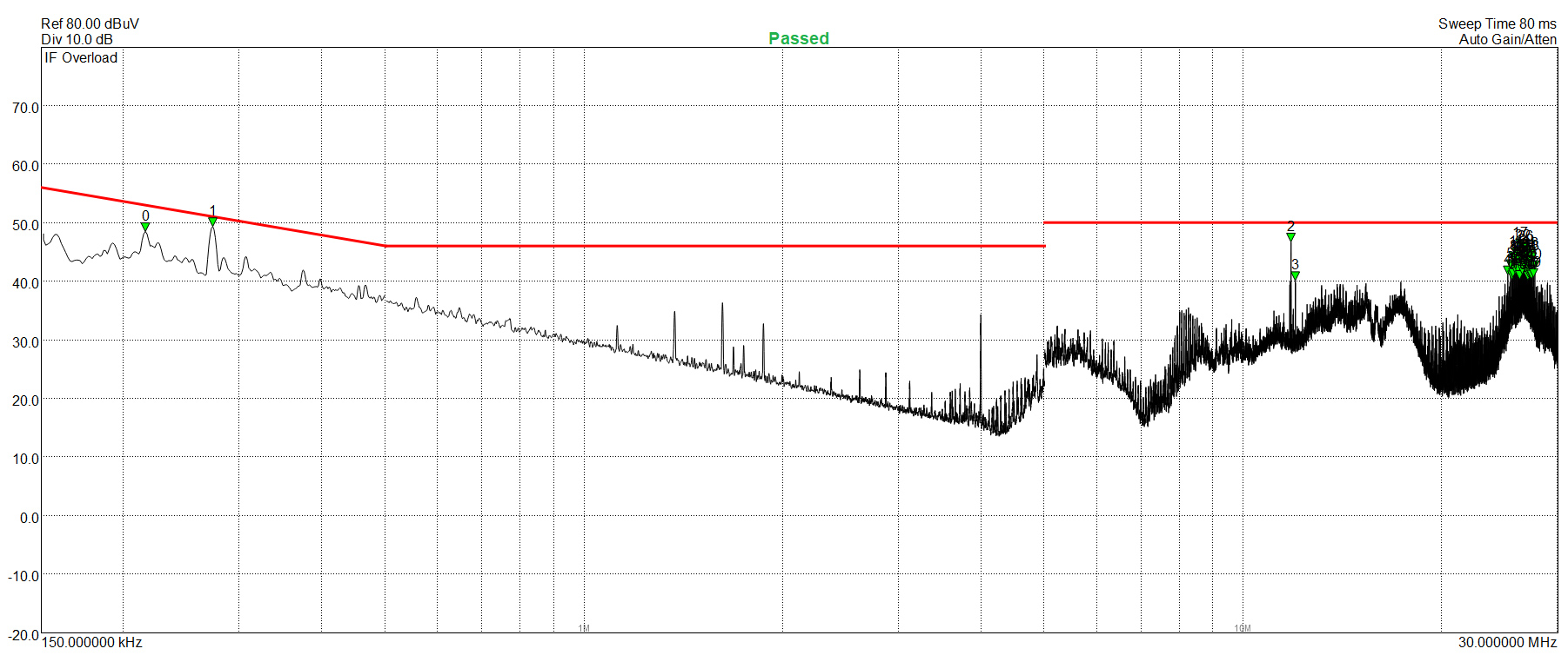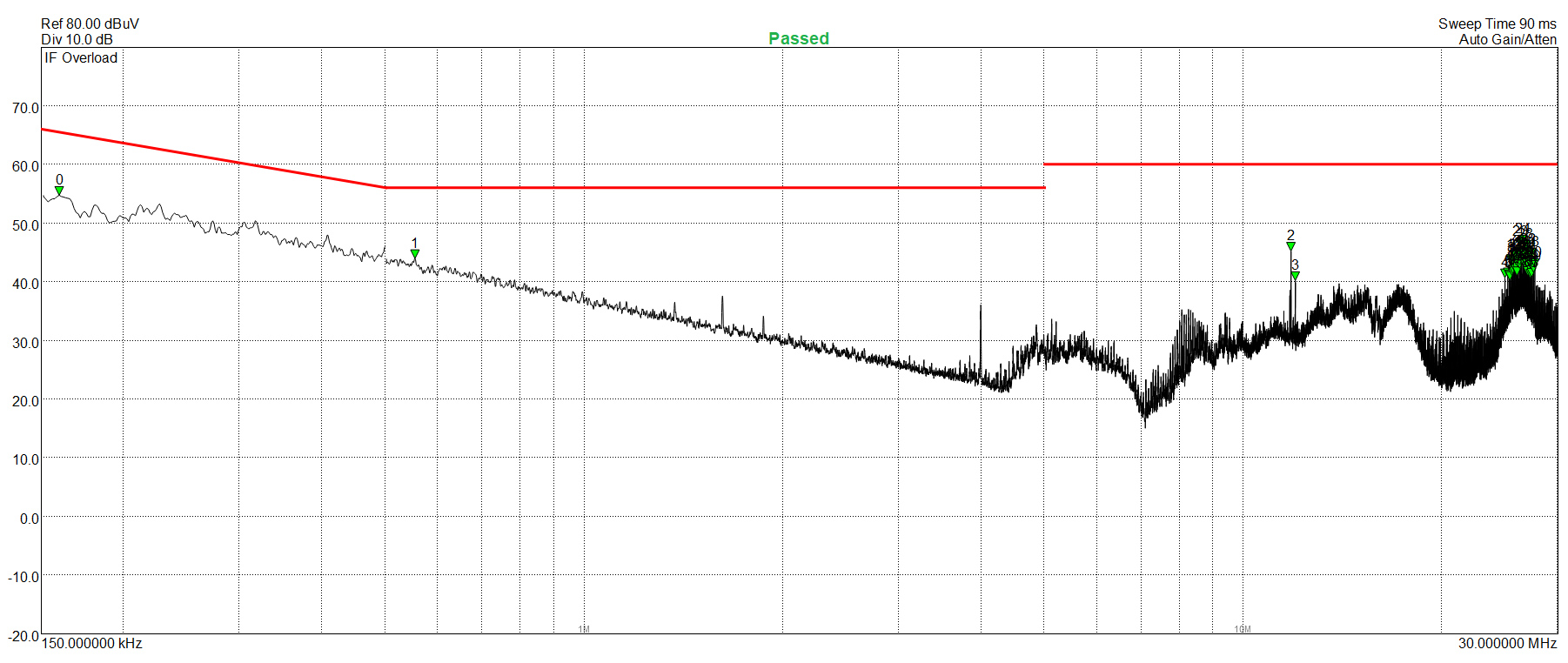 With both AVG and Peak detectors the EMI filter performs well, since it doesn't allow the conducted EMI emissions to exceed the limits.
