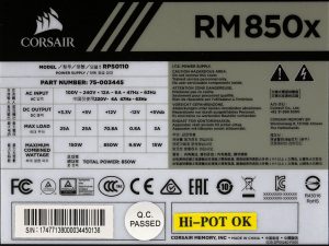 On the sides the large stickers show the model number. The power specifications label is at the bottom side, including the serial number and a High Potential (Hi-Pot) OK sticker.
