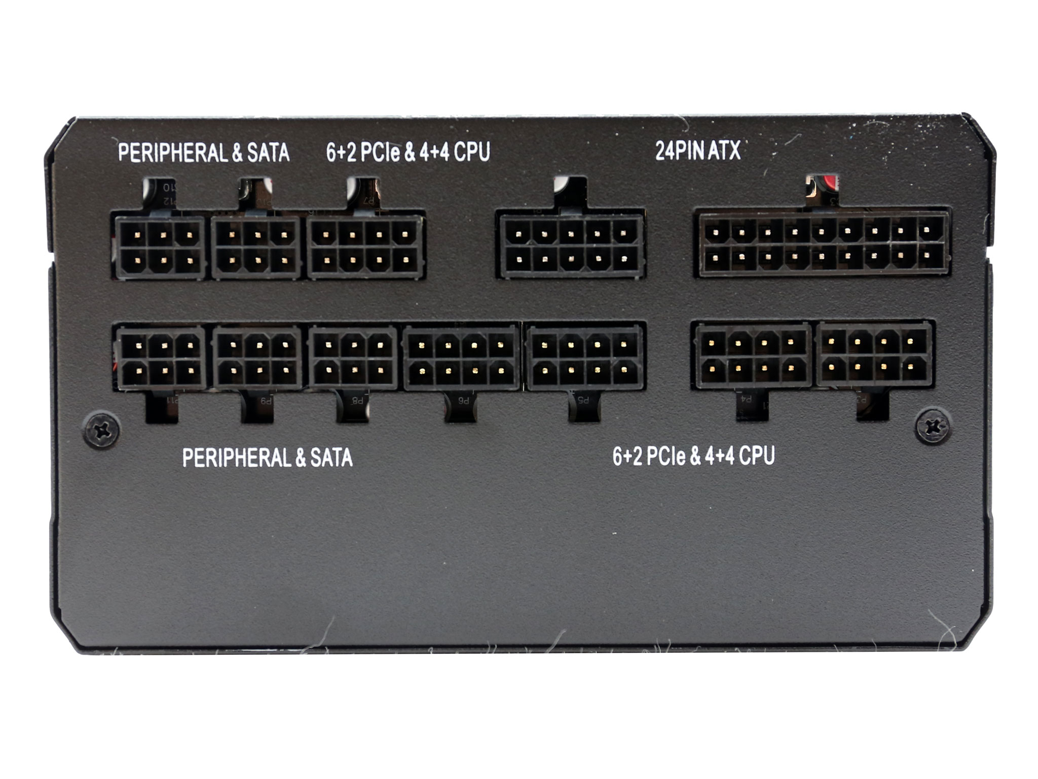 The modular panel includes twelve sockets in total, five for the peripheral cables, an equal number for the EPS and PCIe cables and a pair for the main ATX cable.