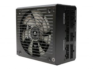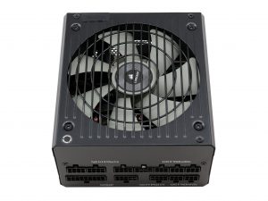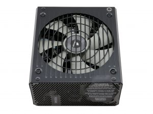 At the face of the box is an angled photo of the power supply, with the side sticker and the modular panel in view. The model number is given in large fonts while above it two badges depict the ten-year warranty and the 80 PLUS Gold certification.
