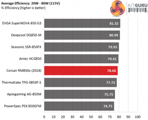In the following tests, we measure the RM850x's efficiency at loads significantly lower than 10 percent of its maximum capacity (the lowest load the 80 PLUS standard measures). The loads we dial are 20, 40, 60, and 80W. This is important for representing when a PC is idle, with power-saving features turned on.
