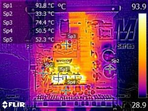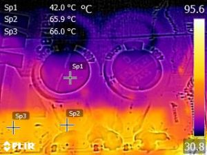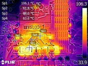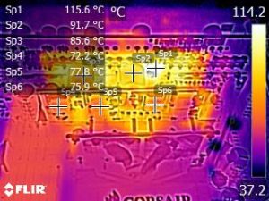 We apply half-load for 10 minutes with the PSU’s top cover and cooling fan removed before taking photos with our modified FLIR E4 camera that delivers 320×240 IR resolution (76,800 pixels).