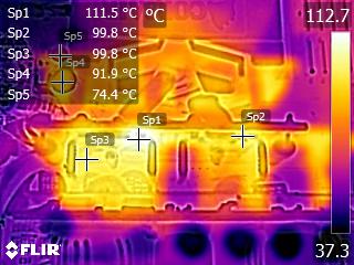 The bus bars on the +12V board get quite hot, exceeding 110°C. This is natural since we push the PSU with 425W load for ten minutes without any active cooling, so those metallic bars have to take the heat off the +12V FETs. As it seems they do a good job since those FETs stay below 80°C. The bulk caps along with the filtering caps on the secondary side don't get too hot, so most likely the prolonged passive operation in this PSU won't create any problems on the long run.