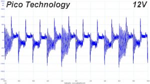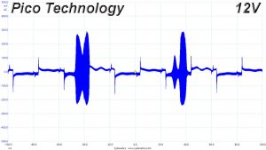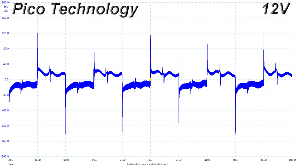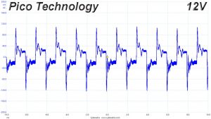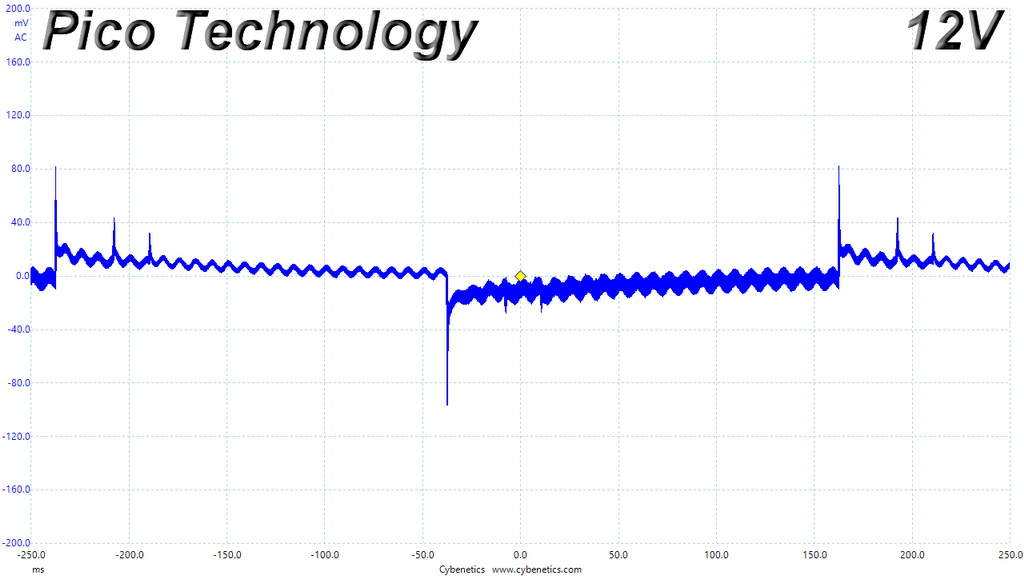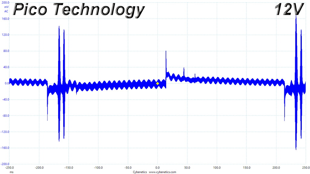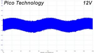 There are no notable spikes and voltage overshoots during the first two tests, however in the last test we notice a region with increased ripple at +12V.