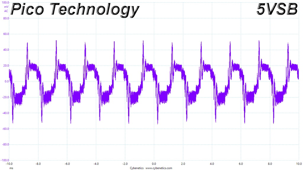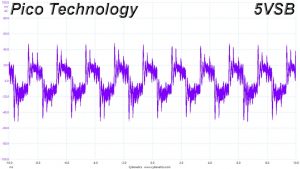 The following oscilloscope screenshots illustrate the AC ripple and noise registered on the main rails (+12V, 5V, 3.3V and 5VSB). The bigger the fluctuations on the screen, the bigger the ripple/noise. We set 0.01 V/Div (each vertical division/box equals 0.01V) as the standard for all measurements.