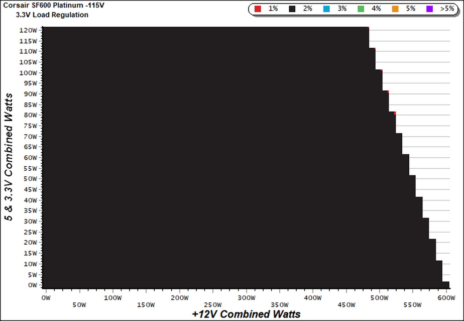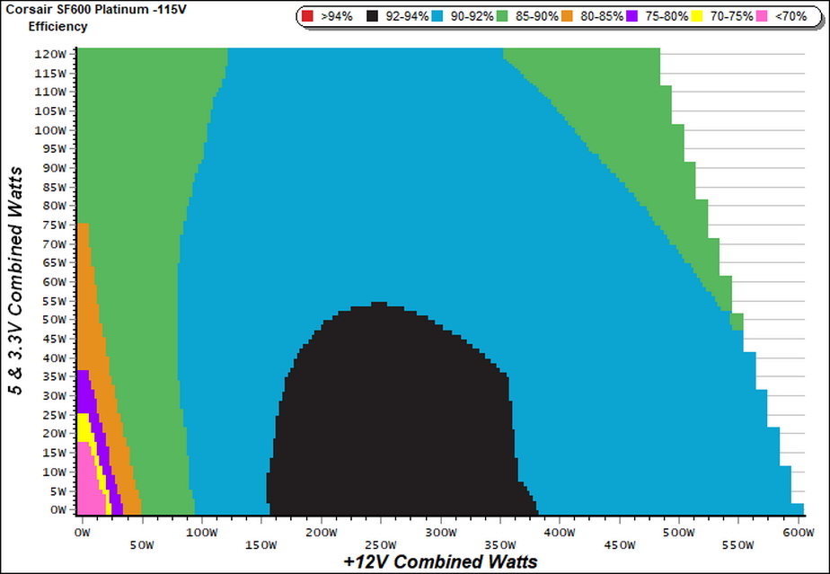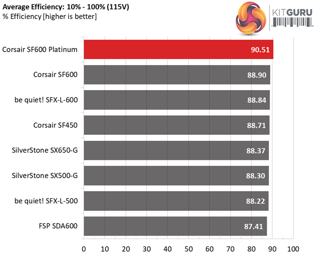 The following graph shows the total performance rating of the SF600 Platinum, comparing it to other units we have tested. To be more specific, the tested unit is shown as 100 percent, and every other unit's performance is shown relative to it.