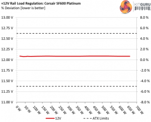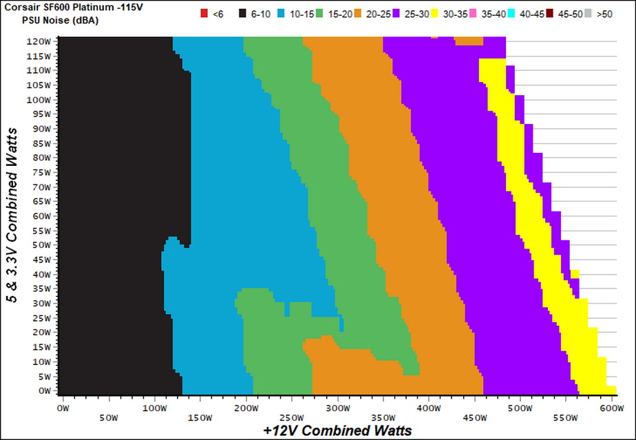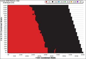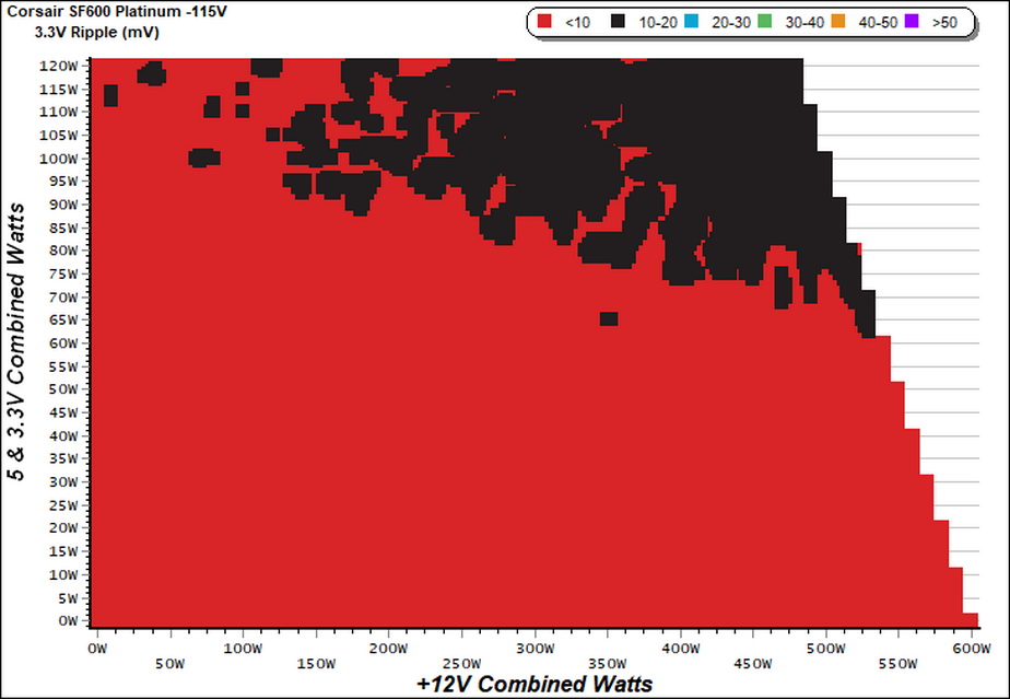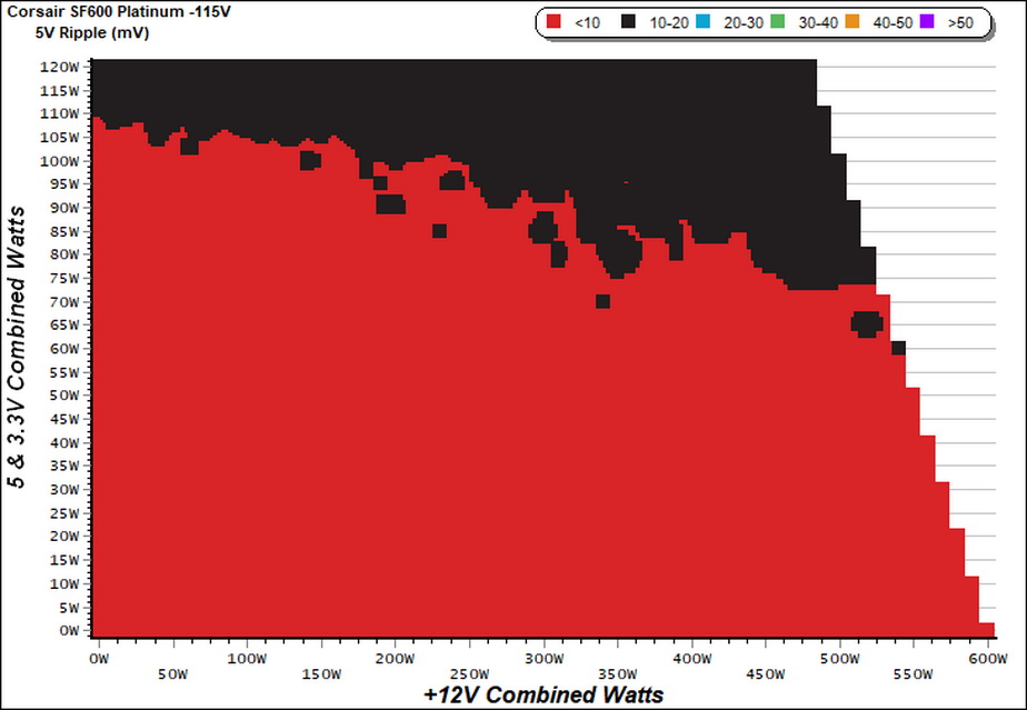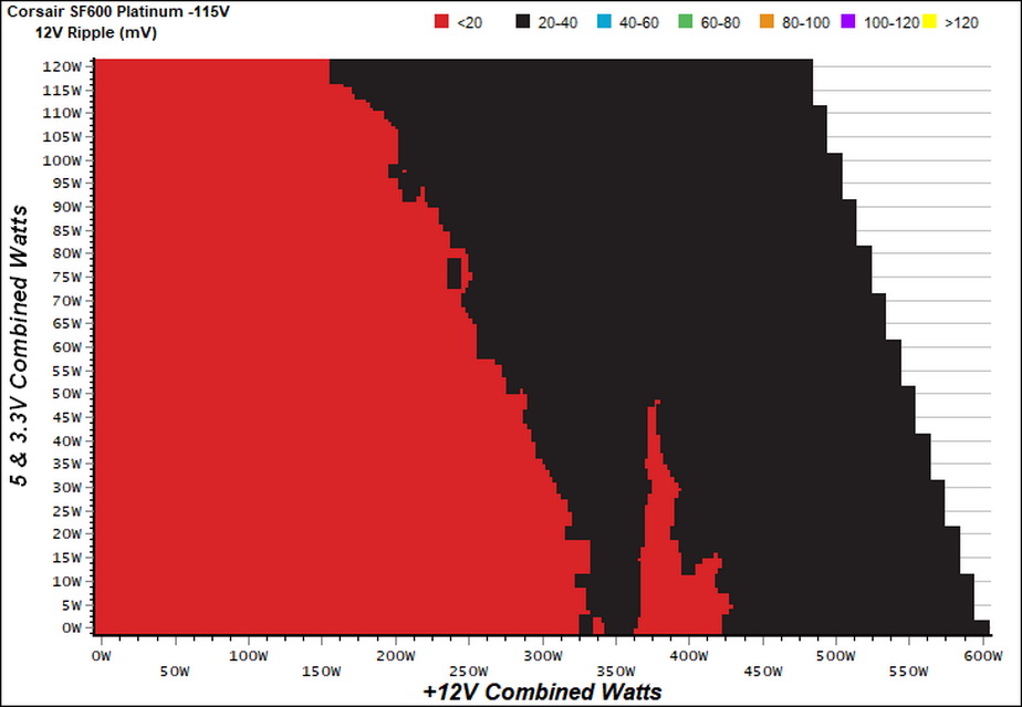 The following table includes the ripple levels we measured on the rails of the SF600 Platinum. The limits, according to the ATX specification, are 120mV (+12V) and 50mV (5V, 3.3V, and 5VSB).