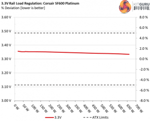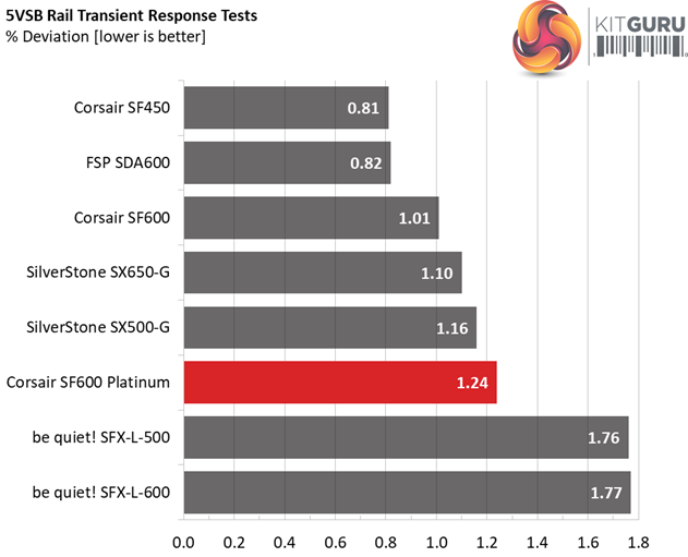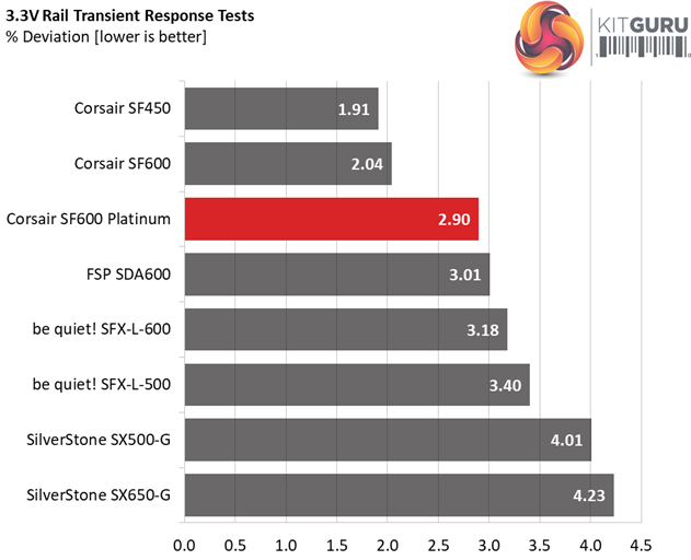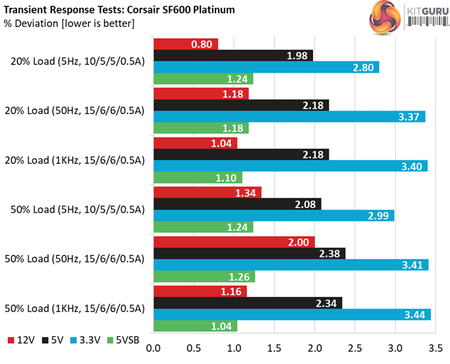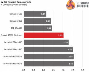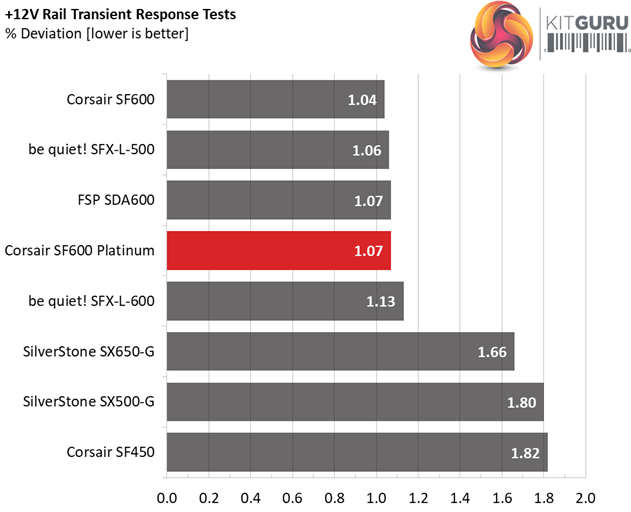 The transient response is good at +12V, for the standards of the SFX category, and quite good on the rest rails. Nonetheless, the gold SF600 unit registers lower deviations on the minor rails.
