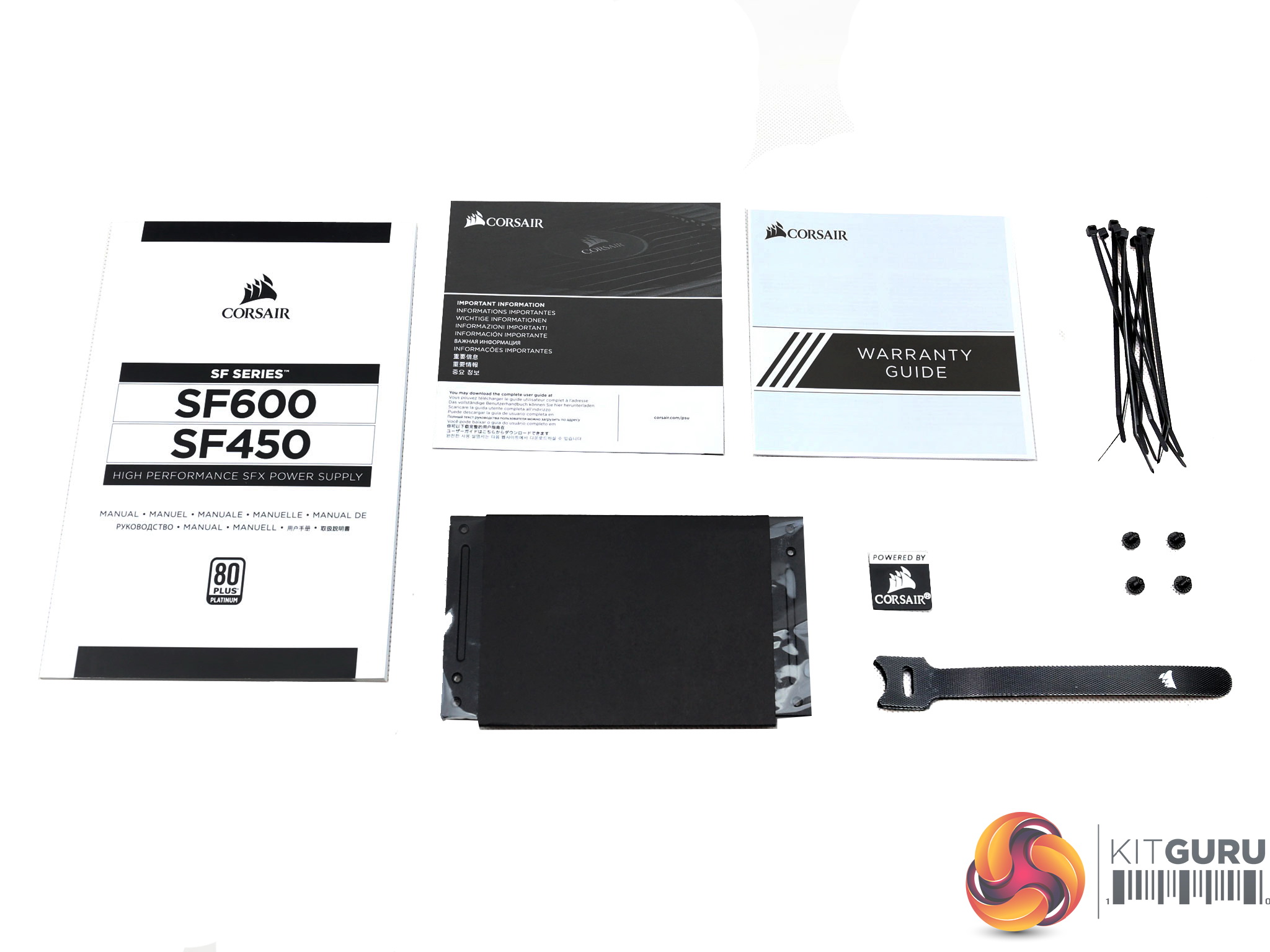 The bundle includes several zip ties and a Velcro strap, fixing bolts, a case badge, the user's manual, a warranty leaflet and the SFX-to-ATX bracket. The latter allows you to mount the unit into a normal ATX case.
