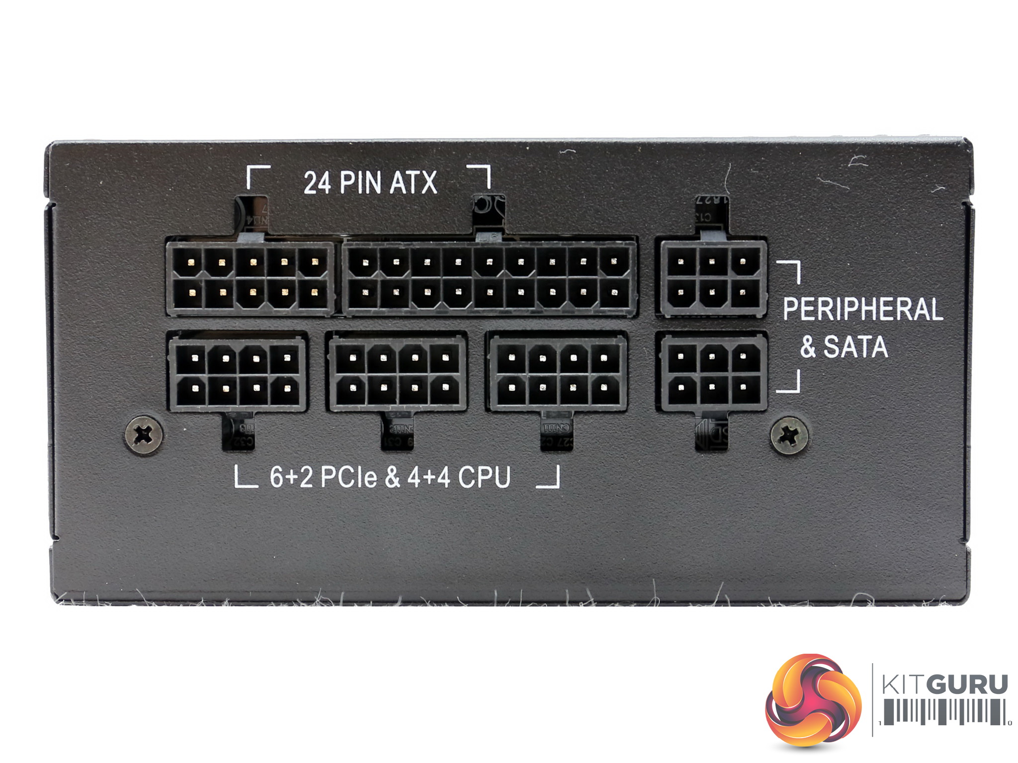 The modular panel hosts seven sockets, which have legends to guide you through the cable connection. The PCIe and EPS sockets are compatible, meaning that you can connect any of the EPS and PCIe cables to them.
