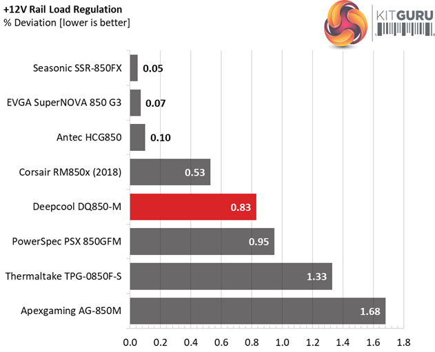 The load regulation at +12V is tight enough, however it cannot compete against the performance of Seasonic's Focus platform. On the 5V and 3.3V rails the deviations are low as well and at 5VSB the load regulation is among the best in this category.