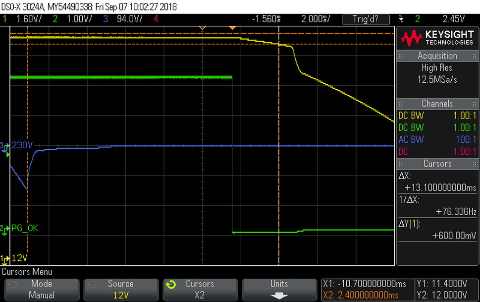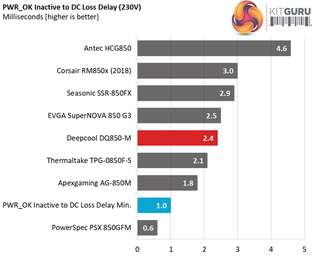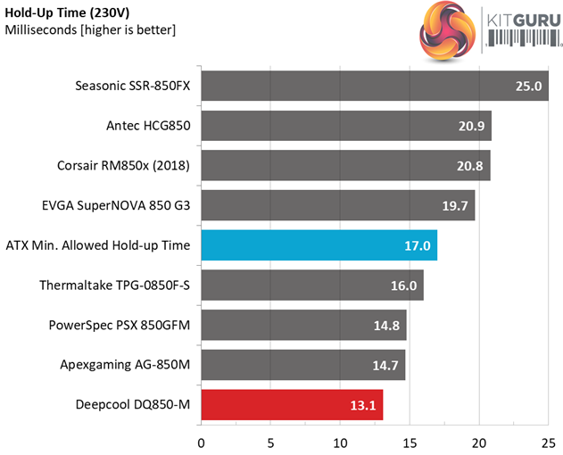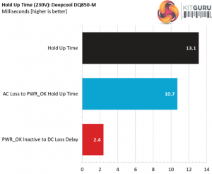 The bulk cap's capacity is not high enough to offer a longer than 17ms hold-up time and this is a great shame. At least the power ok signal is accurate, however it is much lower than 16ms that the ATX spec requires.