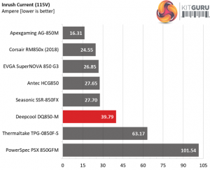 The registered inrush current with both 115V and 230V input is at normal levels for this wattage.