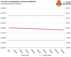 The first set of tests reveals the stability of the voltage rails and the DQ850-M’s efficiency. The applied load equals (approximately) 10 to 110 percent of the power supplies maximum load in increments of 10 percentage points.
