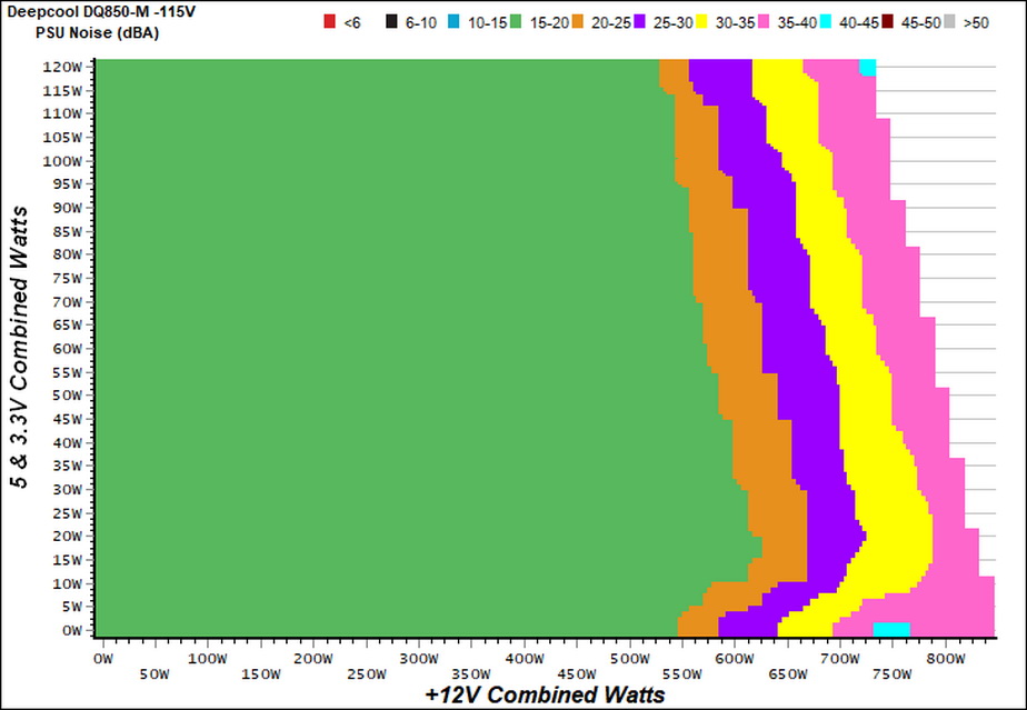 The following graph illustrates the fan's output noise over the PSU's operating range. The same conditions of the above graph apply to our measurements, though the ambient temperature is between 30°C (86°F) to 32°C (89.6°F).