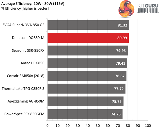 In the following tests, we measure the DQ850-M's efficiency at loads significantly lower than 10 percent of its maximum capacity (the lowest load the 80 PLUS standard measures). The loads we dial are 20, 40, 60, and 80W. This is important for representing when a PC is idle, with power-saving features turned on.