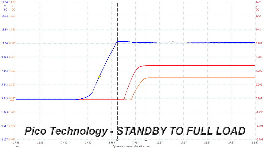 The results are almost perfect. The 3.3V is kept lower than 12V and 5V at all times and the registered peaks are within 20ms.