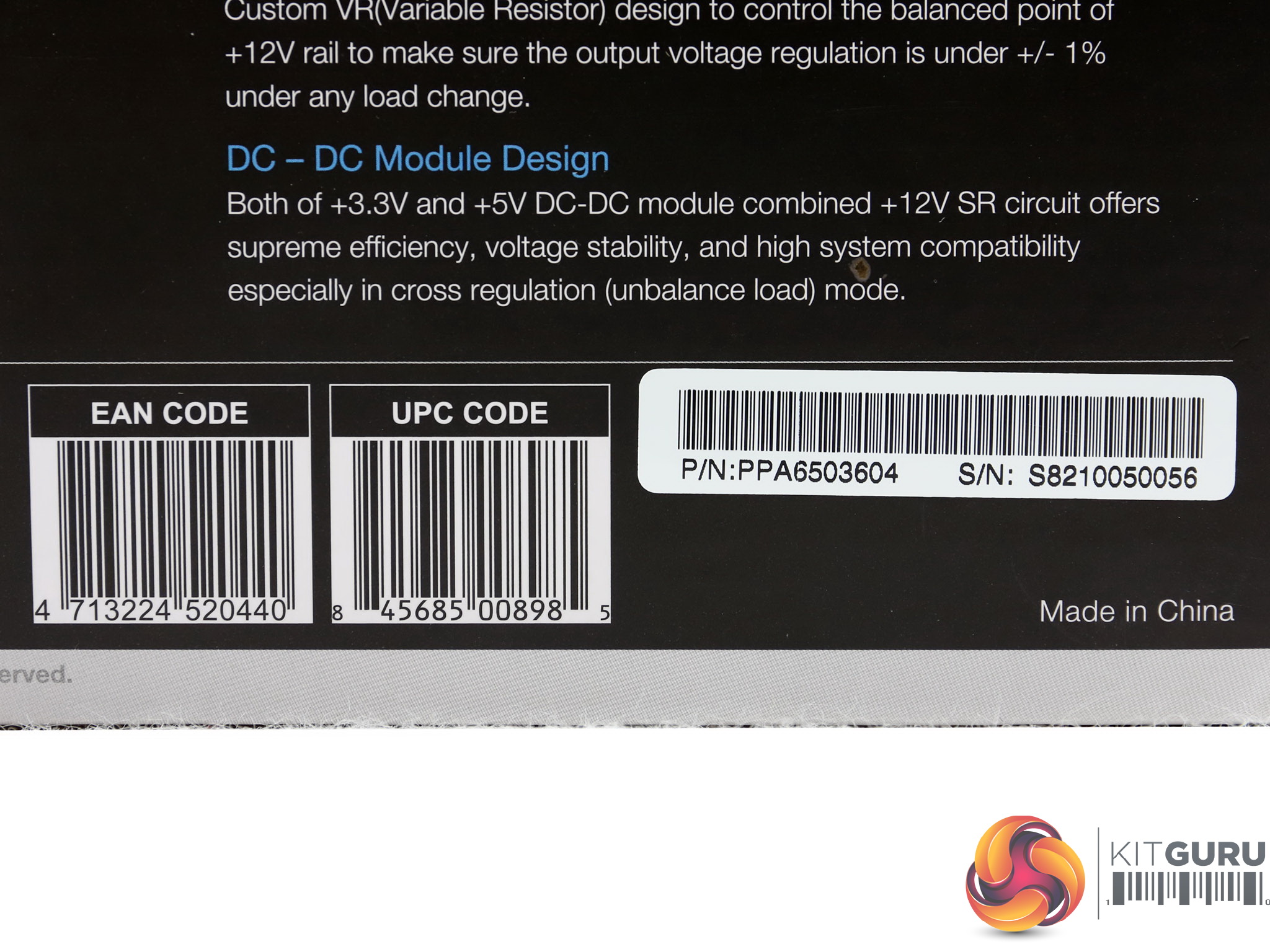 On the sides the stickers depict the line's name, while a large sticker at the bottom side shows the power specifications table along with the product's serial and part numbers.