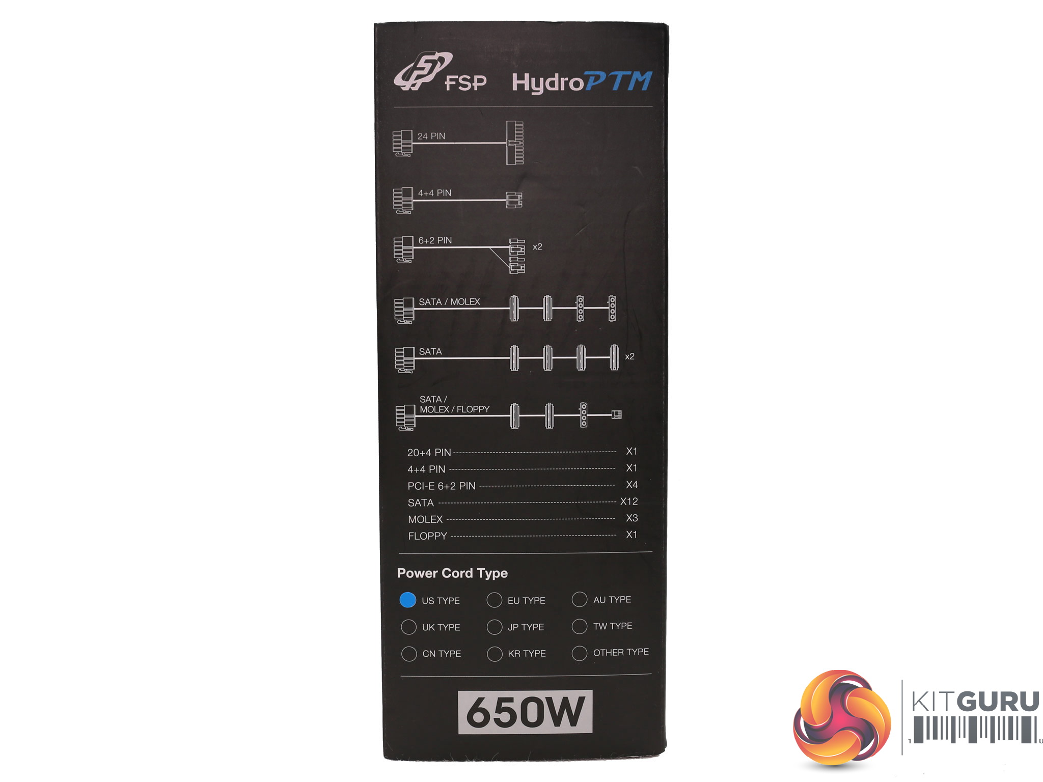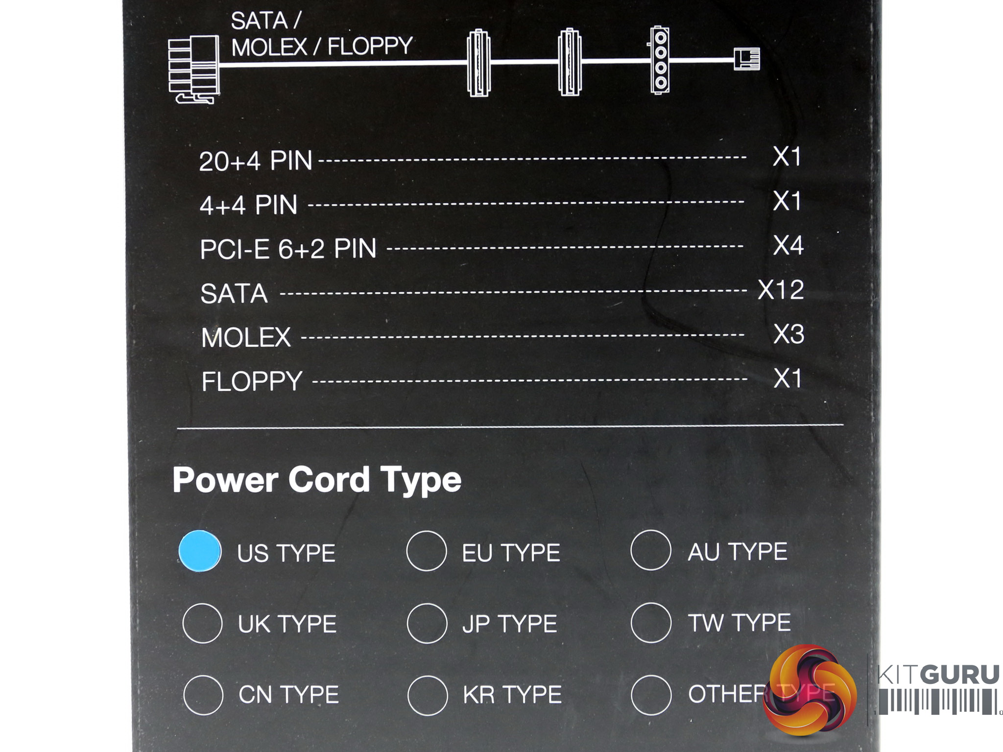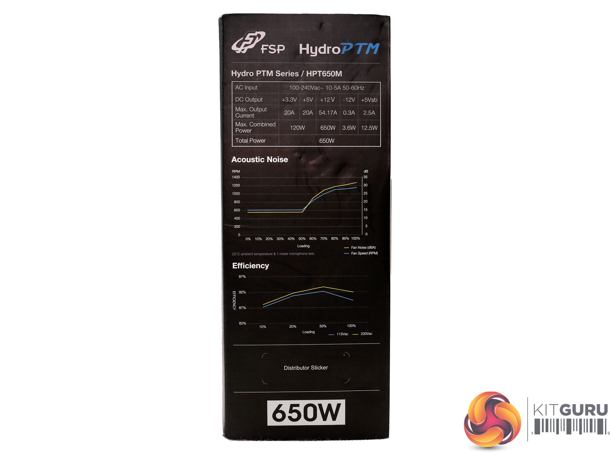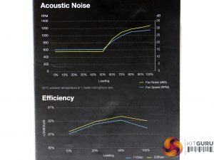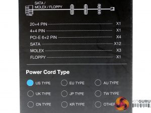 At the sides of the box are the efficiency and fan noise curves, along with the power specifications table and a list of the provided cables and connectors. The power cord type is also shown. Our sample shipped with a US-type cord.