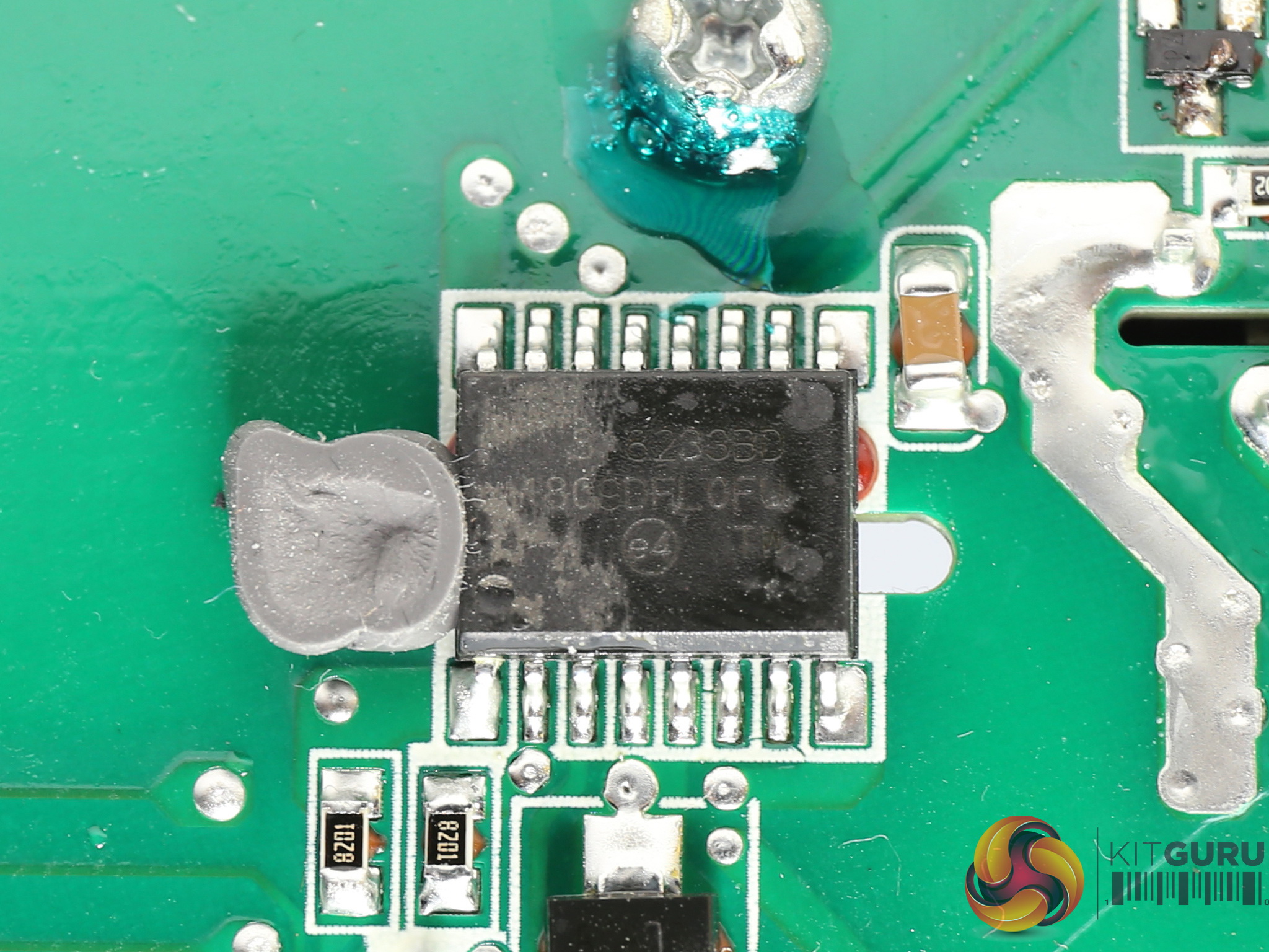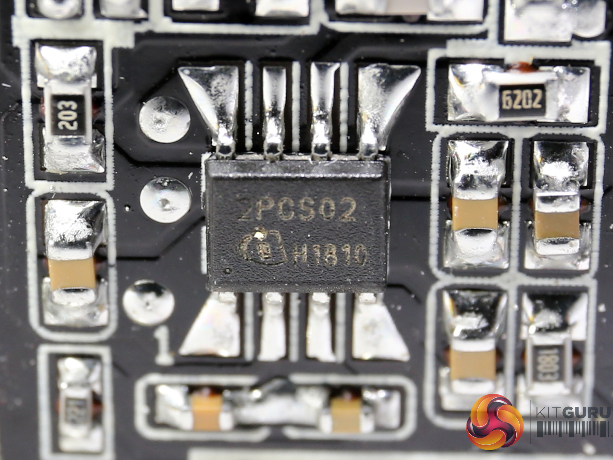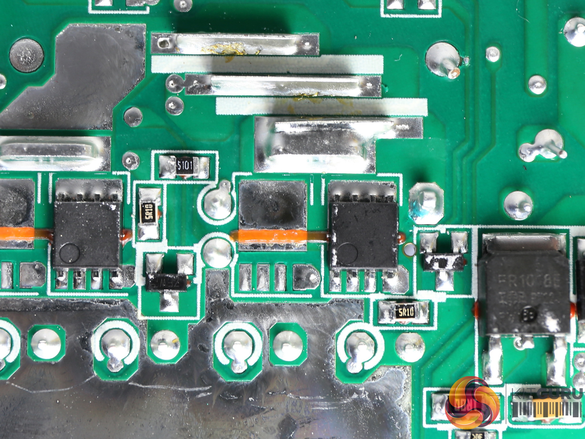 A couple of Toshiba TPHR85 04PL FETs regulate the +12V rail. They are installed on the solder side of the PCB, while two small heatsinks right above them assist in their cooling.