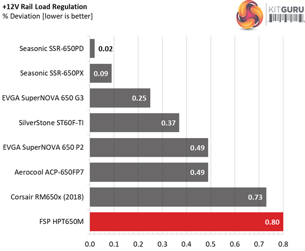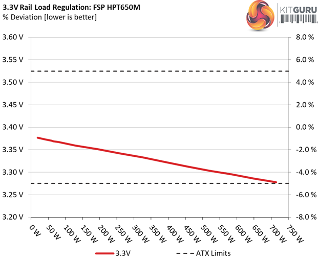 The load regulation at +12V is satisfactory and the 5V rail stays within 2%. The regulation at 3.3V could be much better though, since the competition is way ahead here. This rail might not be so important nowadays, but from the moment it is included in the ATX spec and some components still use it, it should have the best possible performance.