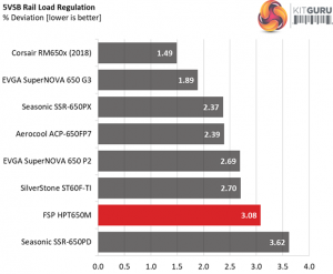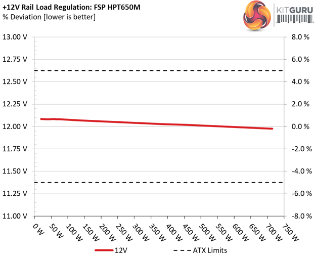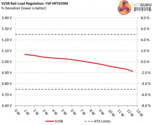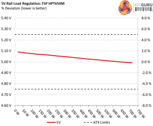 The first set of tests reveals the stability of the voltage rails and the HPT650M’s efficiency. The applied load equals (approximately) 10 to 110 percent of the power supplies maximum load in increments of 10 percentage points.