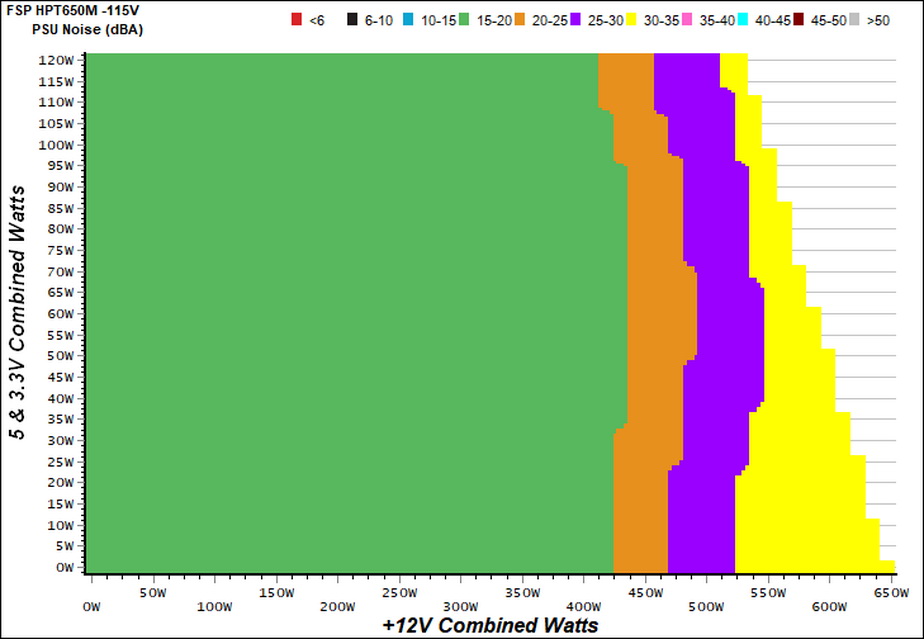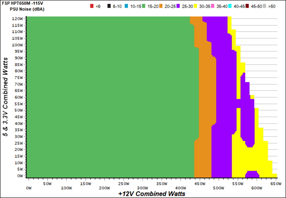 The following graph illustrates the fan's output noise over the PSU's operating range. The same conditions of the above graph apply to our measurements, though the ambient temperature is between 30°C (86°F) to 32°C (89.6°F).