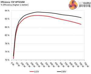 The efficiency with normal loads is high, following closely the Leadex and Prime Platinum platforms. Under light loads FSP's offer has decent performance, however it has a hard time catching up with the competition. Even the 80 PLUS Gold rated, EVGA 650 G3 is ahead of it.