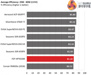 In the following tests, we measure the HPT650M's efficiency at loads significantly lower than 10 percent of its maximum capacity (the lowest load the 80 PLUS standard measures). The loads we dial are 20, 40, 60, and 80W. This is important for representing when a PC is idle, with power-saving features turned on.