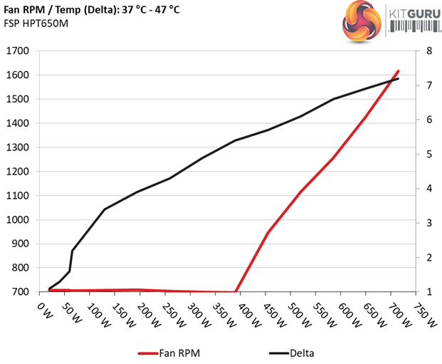 The first chart below illustrates the cooling fan's speed (in RPM), and the delta between input and output temperature. The results were obtained at 37°C (98.6°F) to 47°C (116.6°F) ambient temperature.